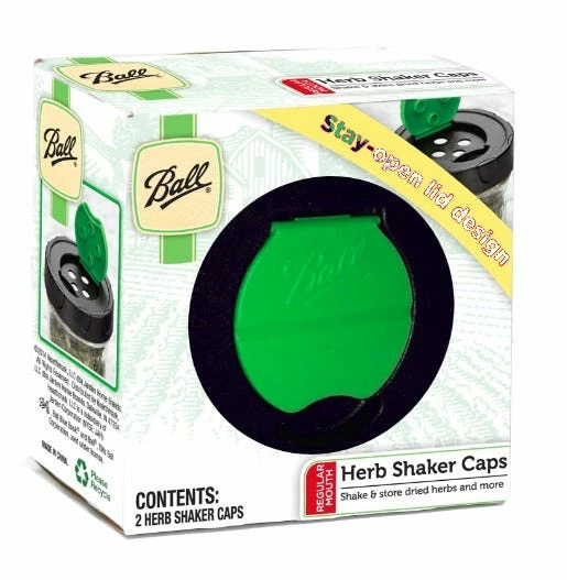 Ball, 2 pack, regular mouth herb shaker lids, contains 2 shaker lids, will fit on any regular mouth ball canning or drinking jar.