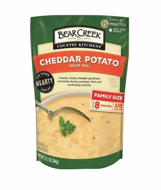 Enjoy a healthy, hearty side or meal with Bear Creek Country Kitchens Cheddar Potato Soup Mix, 12.1 oz. High in the Heber Valley of the Wasatch Mountains, Bear Creek Country Kitchens began with one goal in mind: deliver delicious soups just like mom used to make. Bear Creek soup mix combines high-quality ingredients with its own special blend of spices. This packet helps you make tasty yet easy-to-prepare soup. Just add water and in minutes you can serve piping hot soup that will satisfy most appetites. This cheddar potato soup cooks and is ready to go in 15 minutes. And it has no trans fats. Watching your diet just got a lot simpler with this product. You can have some of this hearty soup ready to go with a salad or sandwich on a cold day.