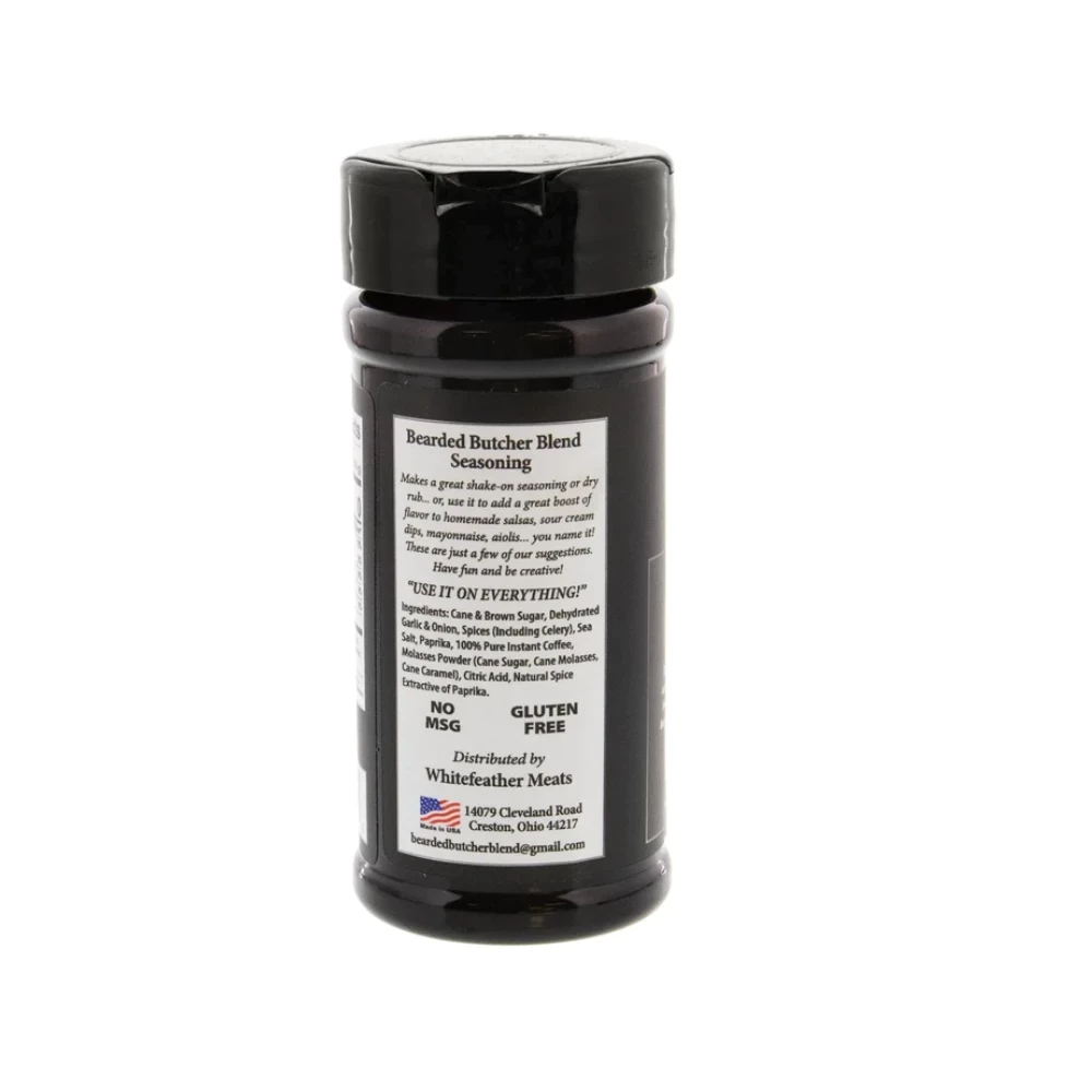 Deep, Dark, and Delicious – Bearded Butcher Blend Black uses coffee and molasses to immerse your taste buds in full, robust flavor. Perfect for steaks, burgers, roasts, game meats, and more! No Gluten, No MSG, No Fillers, and Fillers or Anti-Caking Chemicals