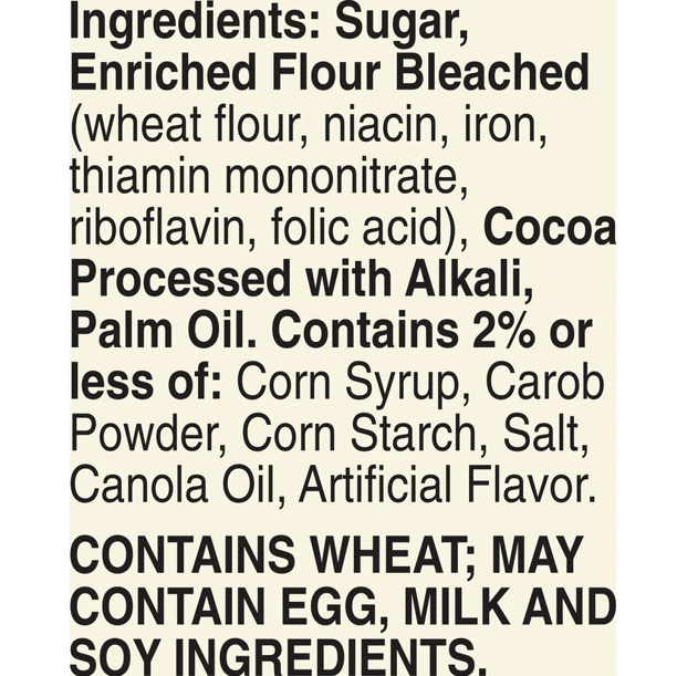 Ingredients: Sugar, Enriched Flour Bleached (wheat flour, niacin, iron, thiamin mononitrate, riboflavin, folic acid), Cocoa Processed with Alkali, Palm Oil. Contains 2% or less of: Corn Syrup, Carob Powder, Corn Starch, Salt, Canola Oil, Artificial Flavor.