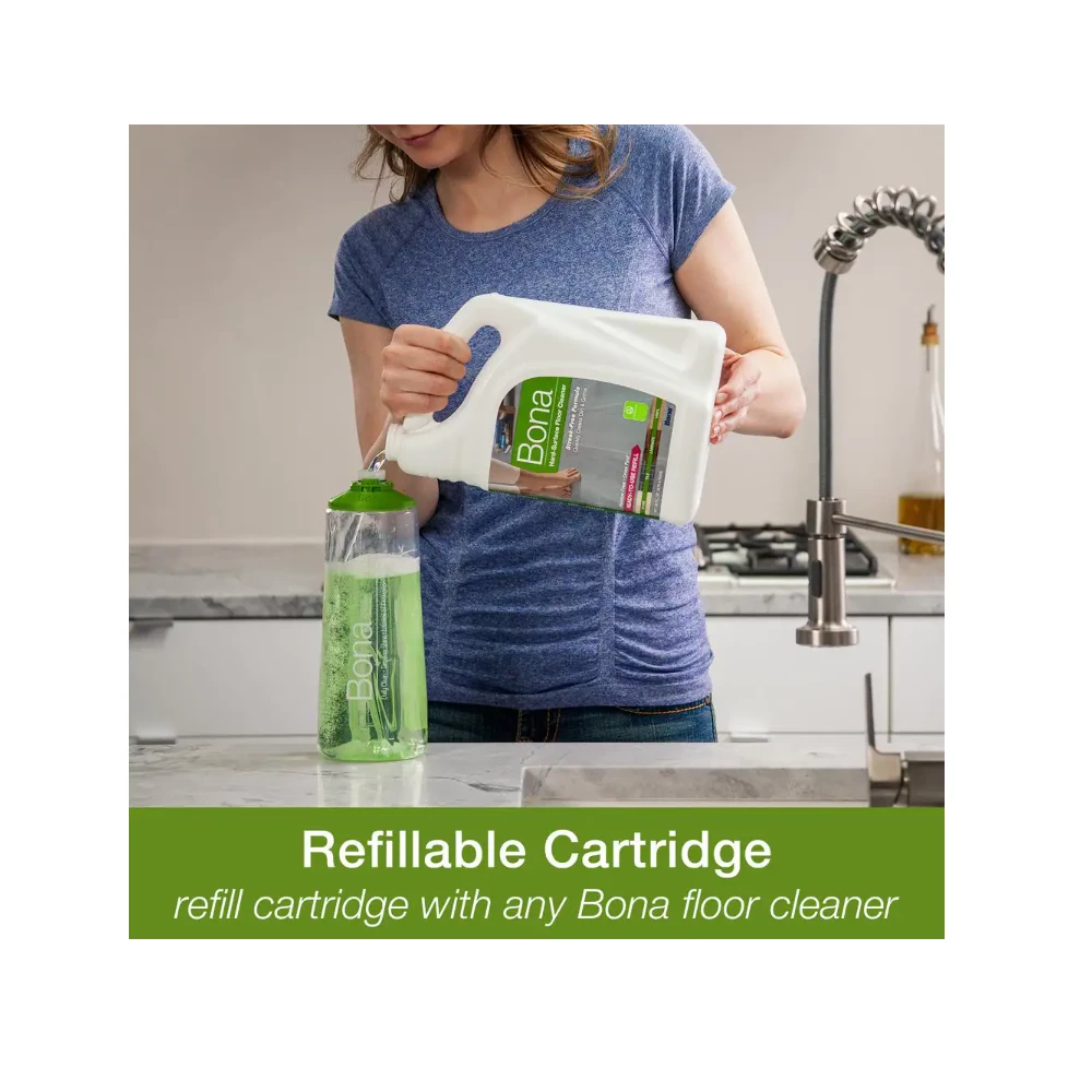 The Bona Premium Spray Mop makes cleaning hard-surface floors effortless. Features a durable, lightweight design, extra-large mop head, refillable cartridge with streak-free Bona Hard-Surface Floor Cleaner, and washable Bona Microfiber Cleaning Pad. The next-generation Bona Premium Spray Mop for Hard-Surface Floors is an all-in-one solution to quickly and easily clean your hard-surface floors. Includes Bona’s waterbased residue-free cleaner in a refillable cartridge and a washable microfiber pad. The rinse-free, streak-free formula cleans hard-surface floors effectively by removing dust, dirt and grime revealing beautiful floors. The extra-large mop head delivers quick and effective cleaning, and the flexible rubber corners protect baseboards and furniture from dings and scratches. A secondary grip allows for added cleaning power, and a retractable hook makes storage easy.