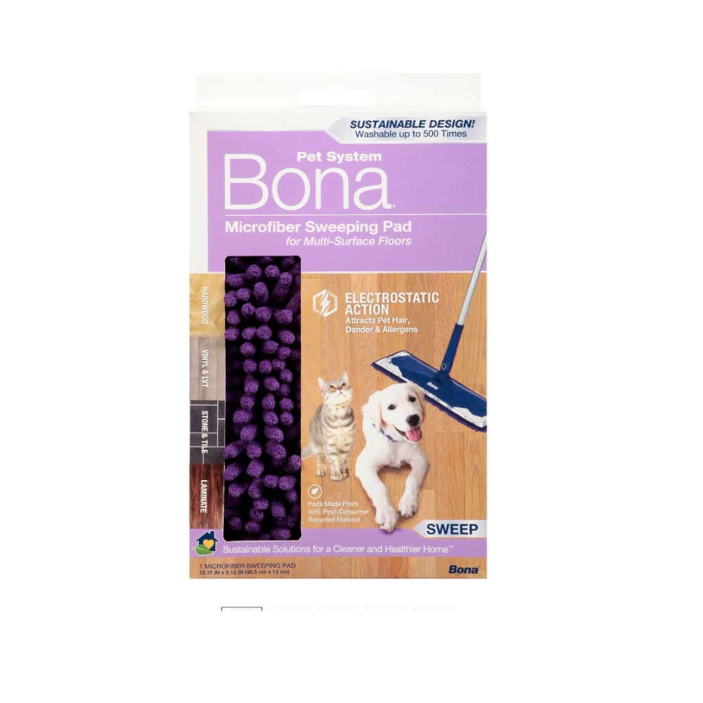 Relax. Bona makes it easy to care for your floors. The Bona Pet System Microfiber Sweeping Pad is the must-have accessory for pet mess clean-up on your floors. The pad works through Electrostatic Action and specially designed microfiber “fingers” that pick-up pet hair, fur, dander and allergens. Love your floors with Bona. Sustainable solutions for a cleaner and healthier home.