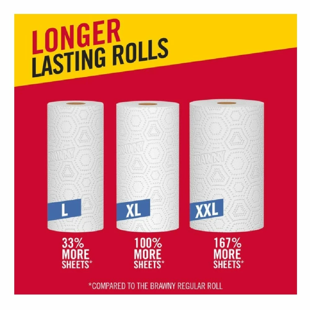 - Brawny® 8 XL Rolls = 16 Brawny® Regular Rolls. Each roll has 120 11”x 5.9” white, 2-ply, Pick-A-Size® sheets