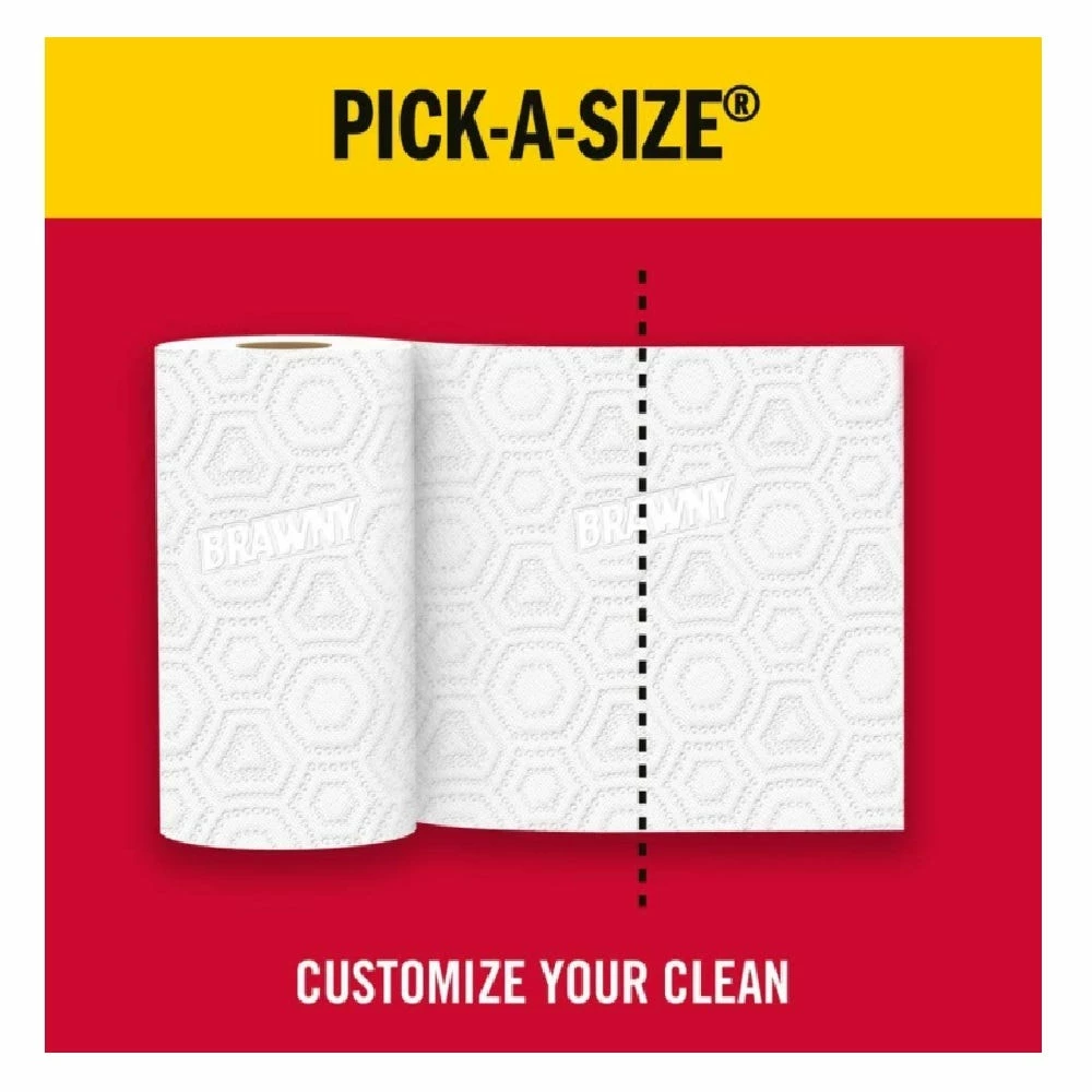 Handle the toughest cleanup jobs with Brawny Pick-A-Size Paper Towels. Made to easily soak up liquids and hold up well as you clean, Brawny paper towels help make tasks like wiping up spills and wiping down countertops go smoothly. Plus, Pick-A-Size rolls help minimize waste by allowing you to only tear off as much as you need.