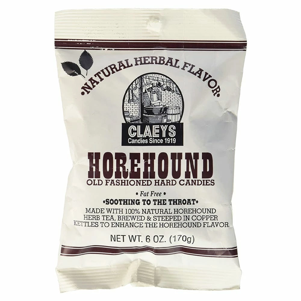 Old fashioned sugar coated hard candies. The horehound candies are made with 100% natural horehound herb flavoring. These drops will help sooth a dry throat. Made in the USA.
