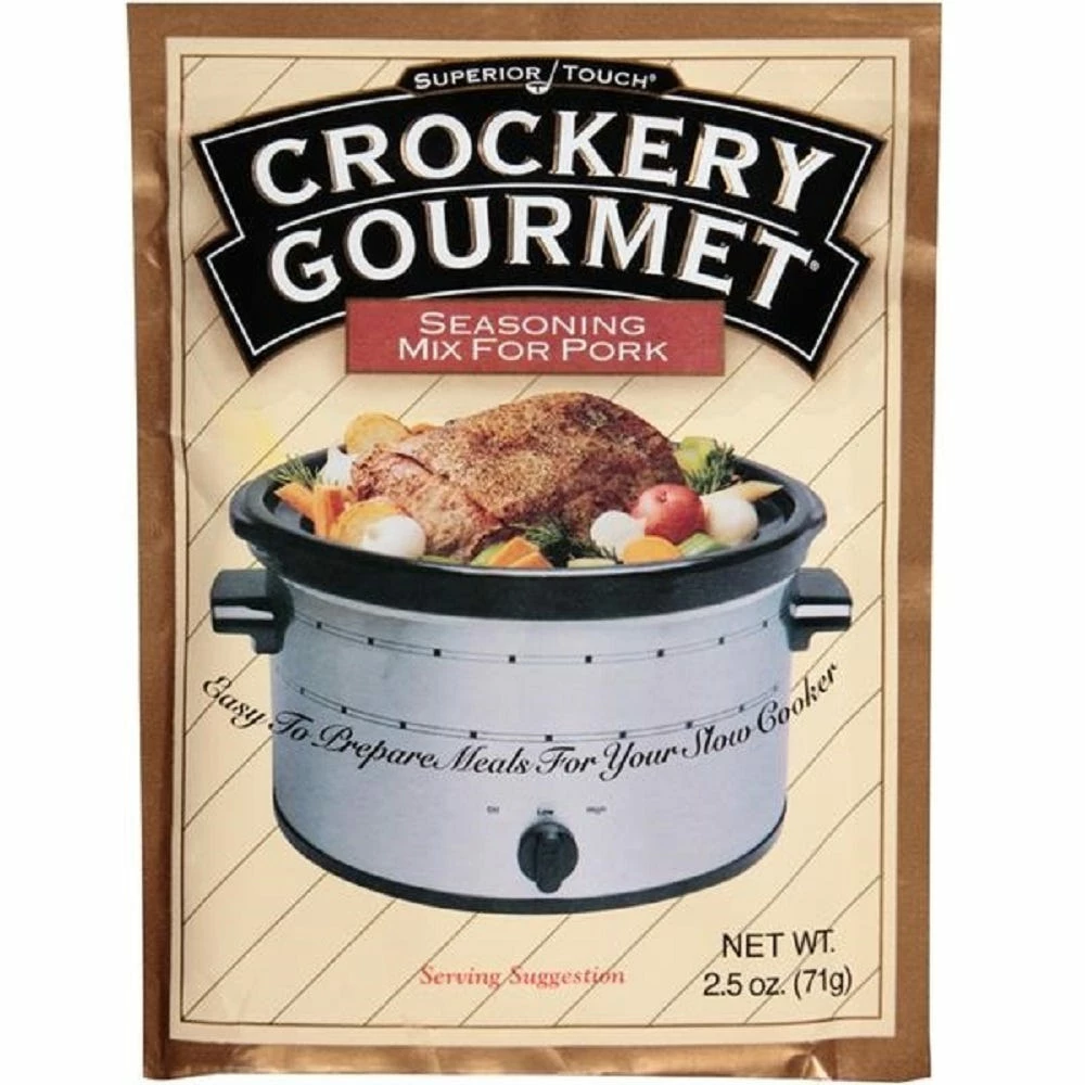 Crockery gourmet pork seasoning mix for pork is a powdered seasoning mix that produces a savory pork flavor for use in crock-pots and other various applications.