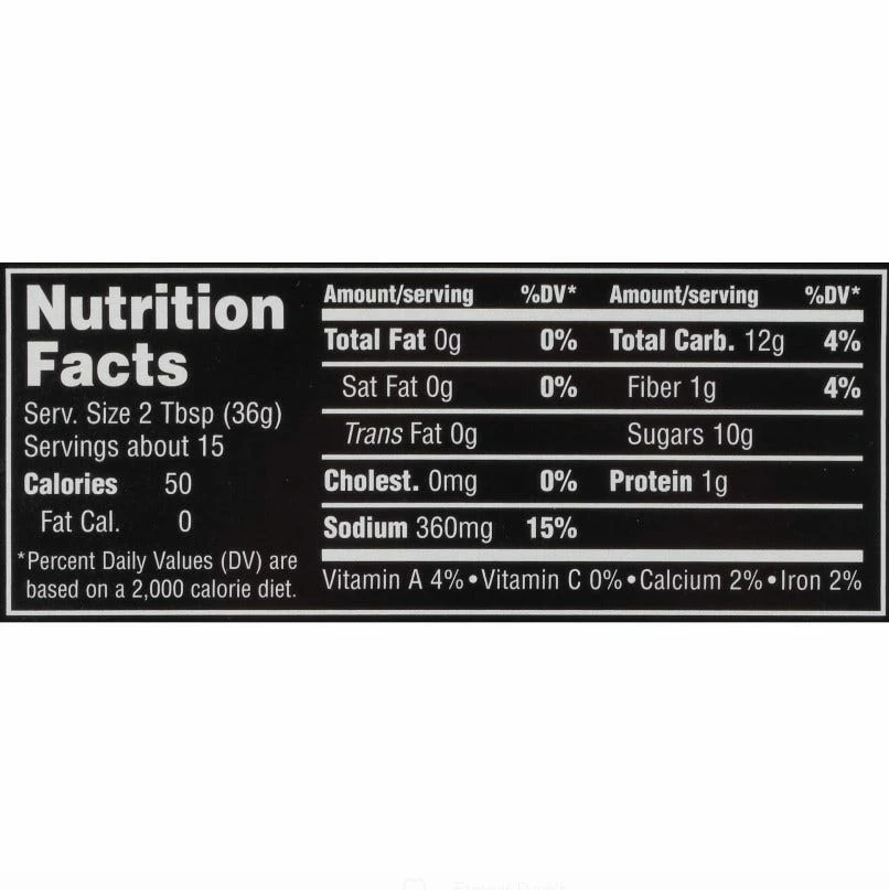 Ingredients: Water, High Fructose Corn Syrup, Tomato Paste, Distilled Vinegar, Sugar, Mustard (Water, Vinegar, Ground Mustard Seed, Salt, Turmeric, Spice), Worcestershire Sauce Concentrate (Vinegar, Molasses, Corn Syrup, Water, Salt, Caramel Color, Garlic, Sugar, Spices, Tamarind, and Natural Flavor), Salt, Pineapple Juice Concentrate, Spices, Molasses, Honey, Soybean Oil, Modified Food Starch, Paprika, Smoke Flavor (Barley Malt, Flour and Natural Hickory Smoke Flavor), Chili Pepper, Hydrolyzed Soy Protein, Natural and Artificial Flavors, Dehydrated Onion, Sodium Benzoate and Potassium Sorbate (Preservatives), Lemon Juice Powder (Corn Syrup Solids, Lemon Juice Solids, Lemon Oil, BHT), Mustard Bran, Garlic Powder, Citric Acid, Caramel Color, Turmeric.