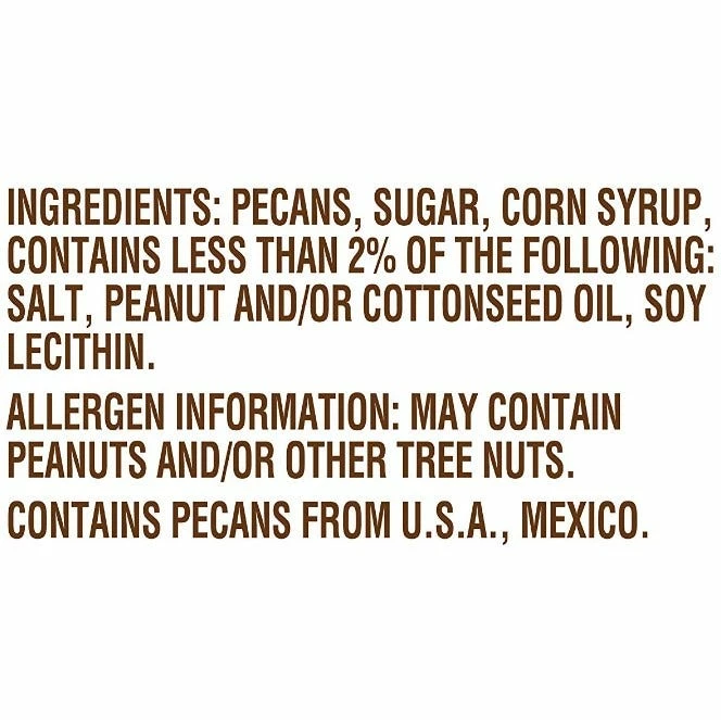 Ingredients: Pecans, Sugar, Corn Syrup, Contains Less than 2% of the Following: Salt, Peanut and/or Cottonseed Oil, Soy Lecithin.