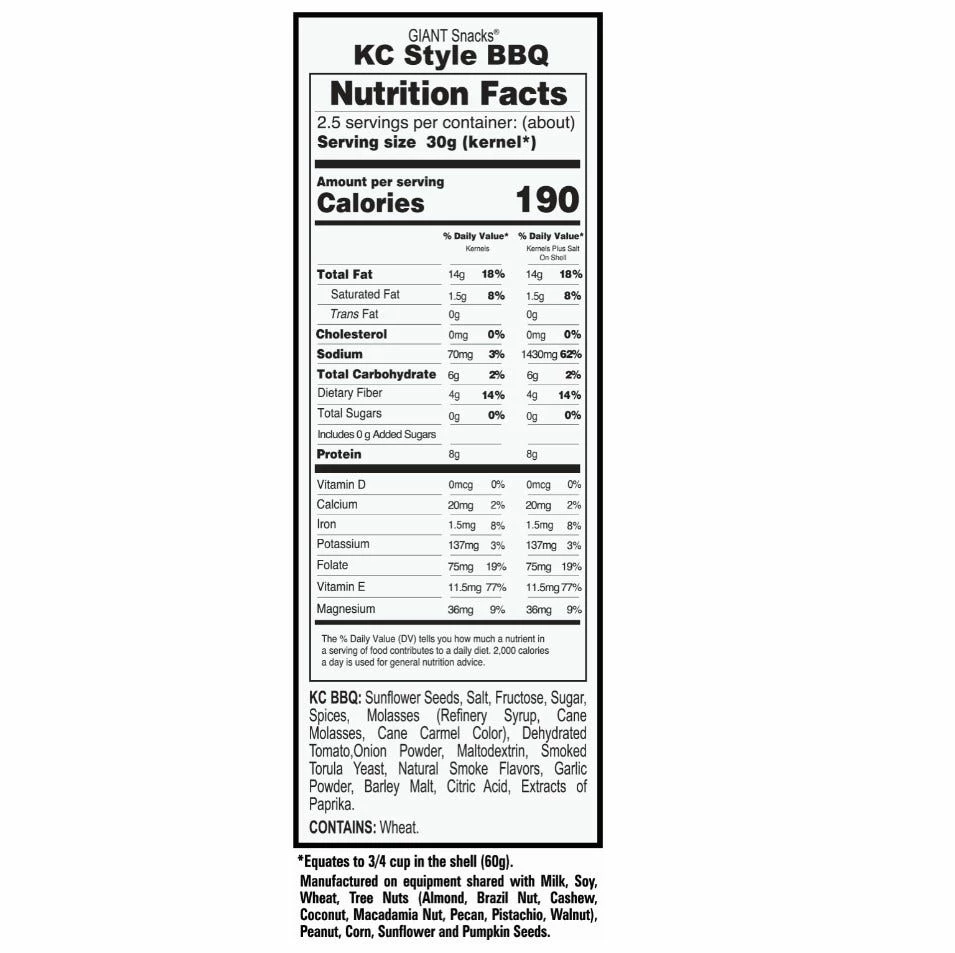 Enjoy Giants Sunflower Seeds—seasoned with a KC style BBQ flavor. This bold BBQ taste along with the jumbo flavor only Giants brand can provide is a favorite of flavored seed lovers. KC Style BBQ comes in a 5 oz. resealable bag.