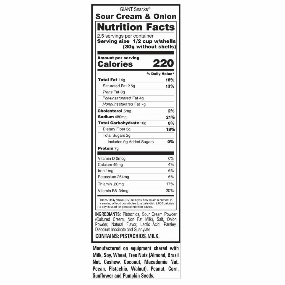 - Pistachios seasoned to perfection with sour cream & onion flavor