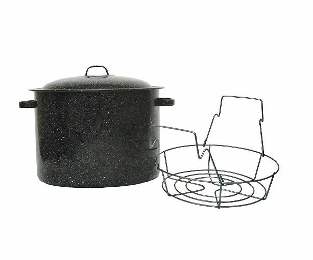 This 12-quart canner with a jar rack holds seven 1-pint containers and comes with a rack for easy lifting. The dark porcelain surface and steel core absorbs energy and evenly distributes heat to the contents. This is a mini canner that’s easy to maintain. In fact, it’s dishwasher safe so just run it through when it needs cleaning up.