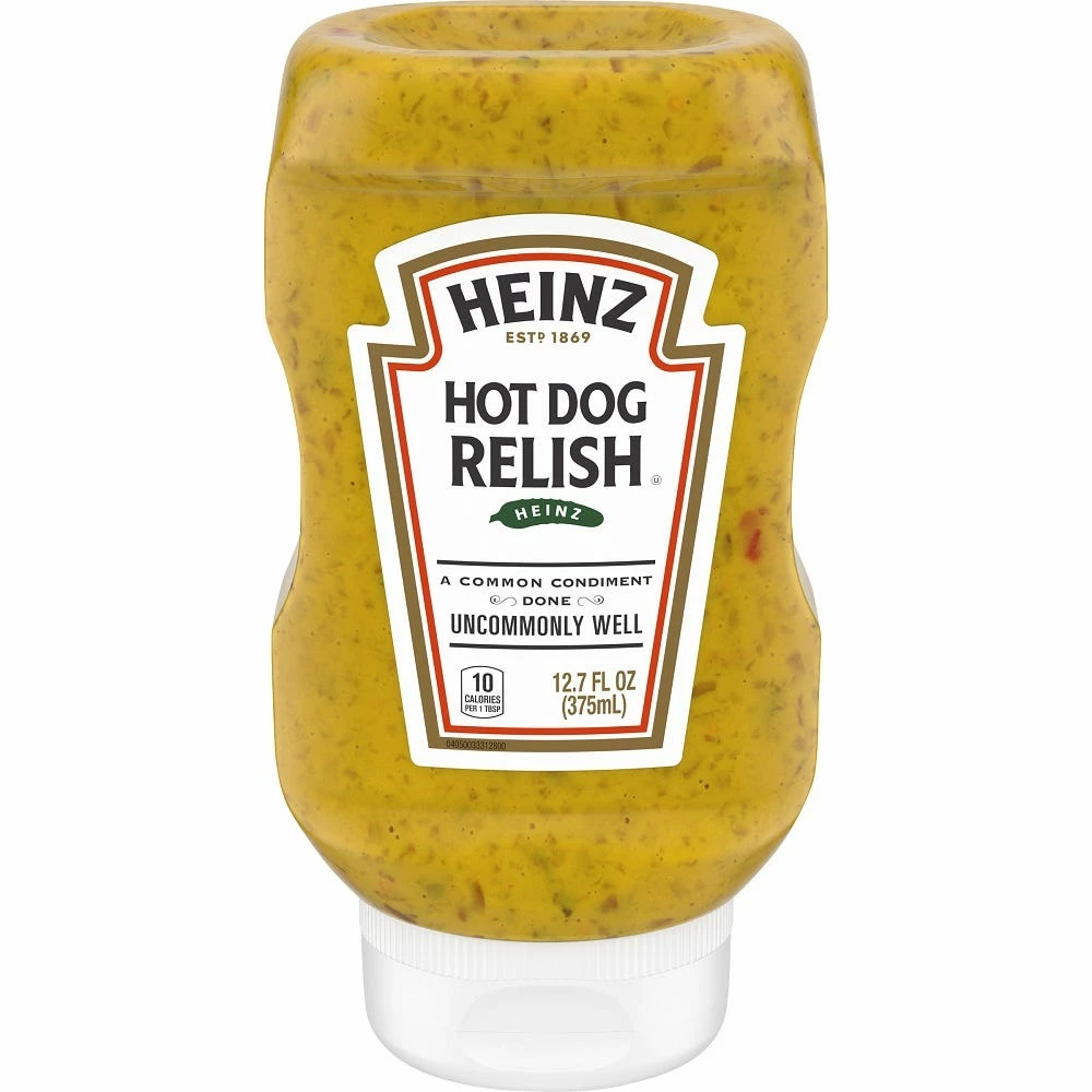 Featuring crunchy pickled cucumber and cabbage immersed in vinegar, the Heinz Hot Dog Relish will help you create flavors which complement your favorite snack. With chunks of red bell pepper and extracts of turmeric, this sweet and spicy relish will add a completely new dimension of flavors to hot dogs, hamburgers, or sausages. Heinz Hot Dog Relish is prepared with care so that every squeezable 12.7 fluid ounce bottle has the perfect ratio of ingredients to complement your favorite foods. Just drizzle this relish on top of your food or use it as a dip and the crunch from cucumbers and cabbage will add life to any meal.