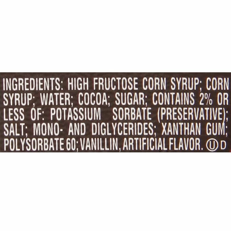 Ingredients: HIGH FRUCTOSE CORN SYRUP; CORN SYRUP; WATER; COCOA*; SUGAR; CONTAINS 2% OR LESS OF: POTASSIUM SORBATE, PRESERVATIVE; SALT; MONO- AND DIGLYCERIDES*; XANTHAN GUM; POLYSORBATE 60; VANILLIN, ARTIFICIAL FLAVOR *adds a negligible amount of fat