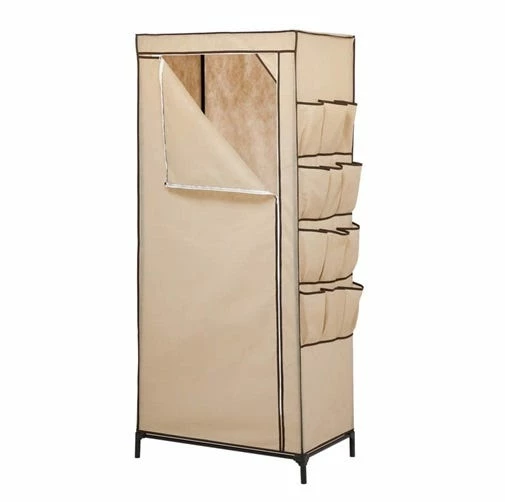 Honey-Can-Do WRD-01270 27″ Wide Portable Cloth Storage Wardrobe, Khaki/Brown Trim. A great choice in economy storage closets, this handy wardrobe measures 27-inches wide and works great for extra hanging space or seasonal storage. The sturdy steel hanging rod will hold all of your dresses, shirts, pants and other items giving you an excuse to shop for more! The breathable, lightweight fabric completely surrounds your garments, protecting them from dust and damage, and offers the convenience of a zippered, full length door for easy access. Integrated 12-pocket exterior storage is perfect for sandals and accessories. Some assembly required.