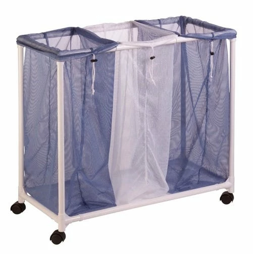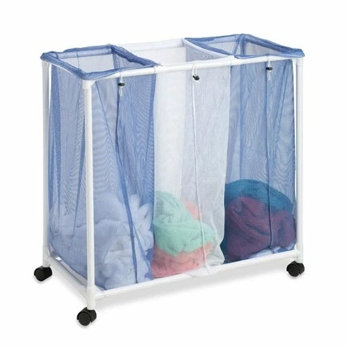 Honey-Can-Do HMP-01629 3-Bag Mesh Rolling Hamper, White / Blue. An economical laundry solution, this rolling hamper has three full-sized compartments to make sorting laundry a breeze. Sturdy, washable mesh bags let clothing breathe and helps keep mildew at bay. Bags are removable and feature a drawstring closure that prevents spilling and doubles as a carrying strap making them quick and easy to transport. Smooth rolling casters on a PVC frame make this sorter light and easy to maneuver. Whether you’re going all the way to the laundromat or just down the hall, this mesh laundry sorter will get you there in comfort and style.