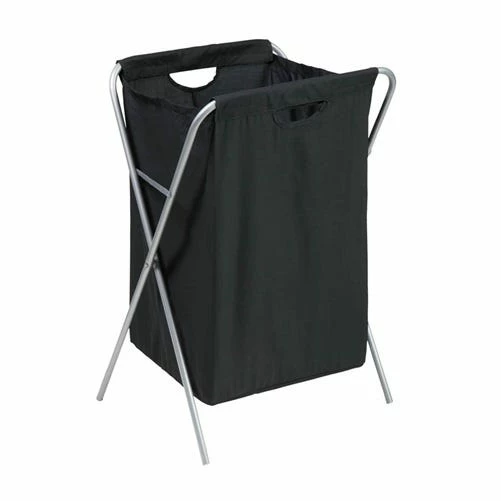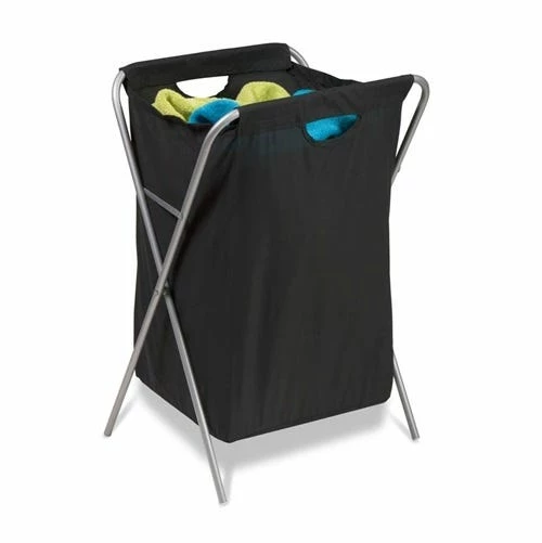 Honey-Can-Do HMP-01635 Folding Xframe Hamper, black. A sleek laundry solution, this black and matte steel x-frame hamper has a foldable frame. When not in use, this hamper folds to flat so it can be quickly and easily moved or stowed away. The nylon cloth bag features built in handles for carrying full loads to the laundry room. The steel frame is both sturdy and rust-resistant.