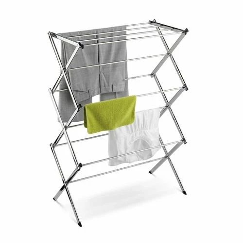 Honey-Can-Do DRY-01234 Commercial Drying Rack, Chrome. This sleek, commercial-grade drying rack boasts heavy-duty construction and a rust-resistant chrome finish. It features angled leg caps for maximum stability. Unlike a wall-mounted unit, this portable rack can be used anywhere including the laundry room, balcony, or bathroom making an attractive drying space out of any room in your home. The space-saving unit offers a full 24-linear feet of drying area and folds down to a mere 3-inches flat for easy storage when not in use. A top shelf provides ample space for drying folded items such as sweaters. Save on energy costs while protecting the environment and increasing the life of your garments.