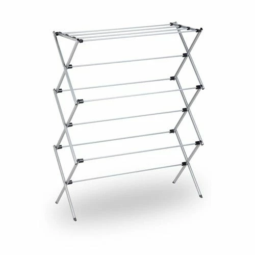 Honey-Can-Do DRY-02119 Deluxe Oversize Metal Drying Rack, Silver. This sleek, silver-coated steel drying rack is sturdy and rust-resistant. Unlike a wall-mounted unit, this portable rack can be used anywhere including the laundry room, balcony, porch, bathroom, or kitchen making an attractive drying space out of any room in your home. The space-saving unit offers 28.5-linear feet of drying area when fully assembled and folds down to 3-inches flat for easy storage when not in use. Save on energy costs while protecting the environment and increasing the life of your garments.