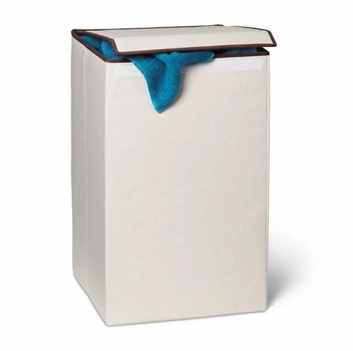 This square hamper with lid provides an attractive yet functional vestibule for managing your laundry. This laundry hamper folds easily when not in use, great for guest rooms, car travel, and dorms. The integrated lid closes with Velcro, keeping contents hidden and odors contained for a neat room in seconds. Constructed from a cotton poly blend with an inner plastic liner to help reduce mildew, this clothes hamper is ideal for use in the bathroom, laundry room and more.