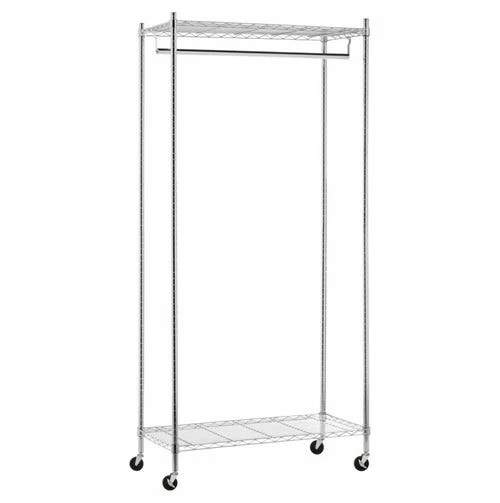Honey-Can-Do GAR-01120 Heavy Duty Chrome, Rolling Garment Rack. This sturdy garment rack is made from a steel construction and goes from room to room on smooth rolling swivel casters that easily lock in place. The hanging bars adjust to accommodate short or long garments and are perfect for managing out-of-season clothing, outdoor gear, or items hung to dry in the laundry room. Steel shelving above and below offers ample storage space for other essentials.