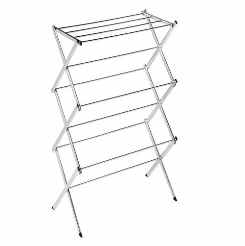 Honey-Can-Do DRY-01107 Slim Chrome Commercial Drying Rack, Silver. Dry your clothes naturally with this chrome-finished drying rack. For indoor or occasional outdoor use, the rack is made from a coated steel frame making it sturdy and rust-resistant. This portable rack can be used anywhere such as the laundry room, balcony, porch, bathroom, or kitchen and folds down to 3″ flat for easy storing. The top tier has 4 cross bars and is ideal for air-drying delicate items such as shirts, hosiery, and lingerie. With 18-linear feet of capacity to air-dry clothes using minimal floor space, this expandable drying rack is a great space-saver.