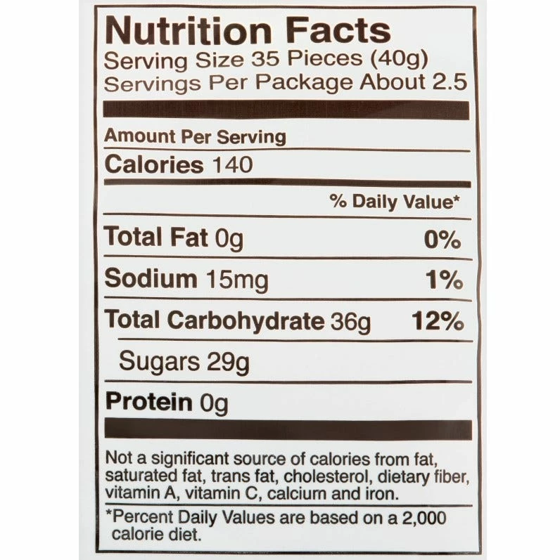 Ingredients: Sugar, Corn Syrup, Modified Food Starch, Contains 2% or Less of the Following: Sodium Citrate, Phosphoric Acid, Natural and Artificial Flavor, Color Added, Red 40 Lake, Blue 2 Lake, Red 40, Yellow 5 Lake, Vegetable and Fruit Juice (Color) Beeswax, Carnauba Wax, Confectioner’s Glaze, Caffeine.