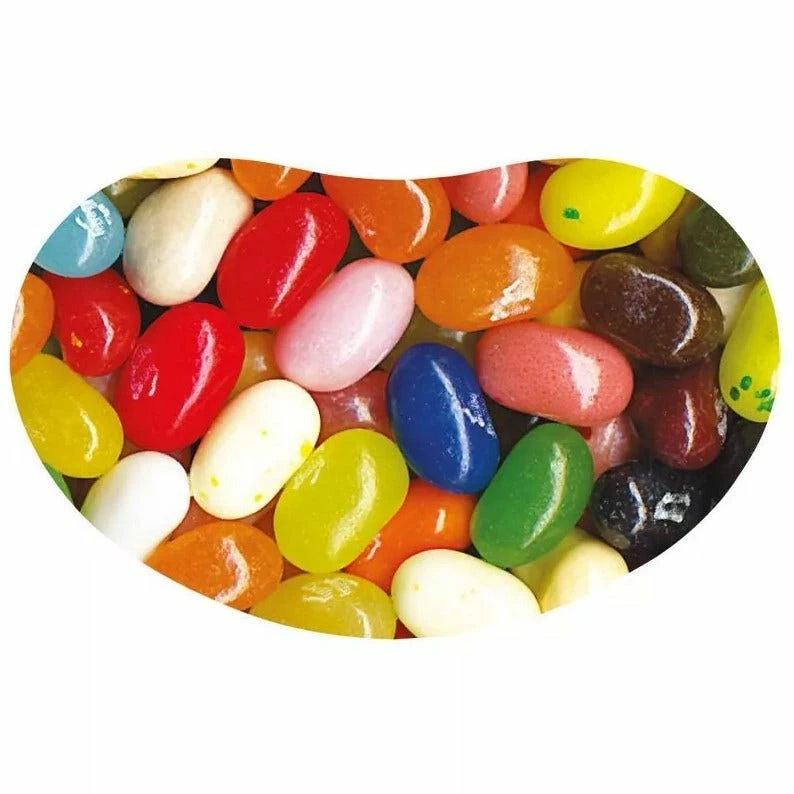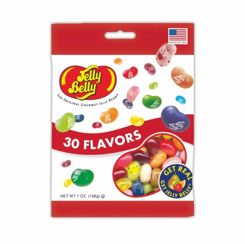 Jelly Belly® 30 Flavors Jelly Beans. The original gourmet jelly bean. Naturally and artificially flavored with blueberry, bubble gum, buttered popcorn, cappuccino, caramel corn, chocolate pudding, coconut, cotton candy, A&W® cream soda, Dr. Pepper®, French vanilla, green apple, juicy pear, Sunkist® lemon, lemon lime, licorice, orange sherbet, peach, pina colada, pomegranate, red apple, A&W® root beer, sizzling cinnamon, strawberry cheesecake, Sunkist® tangerine, toasted marshmallow, top banana, tutti-frutti, very cherry, watermelon.