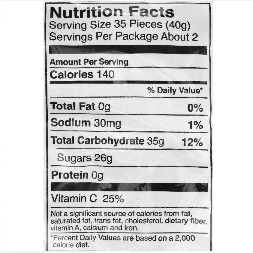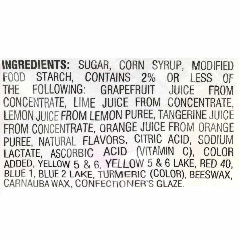 Ingredients: Sugar, Corn Syrup, Modified Food Starch, Contains 2% or Less of the Following: Grapefruit Juice from Concentrate, Lime Juice from Concentrate, Lemon Juice from Lemon Puree, Tangerine Juice from Concentrate, Orange Juice from Orange Puree, Natural Flavors, Citric Acid, Sodium Lactate, Color Added, Yellow 5 & 6, Yellow 5 & 6 Lake, Red 40, Blue 1, Blue 2 Lake, Turmeric (Color), Beeswax Carnauba Wax Confectioner’s Glaze.