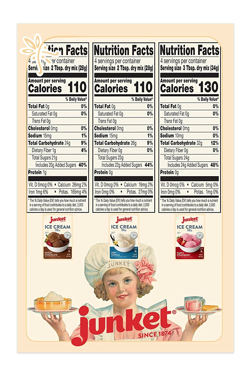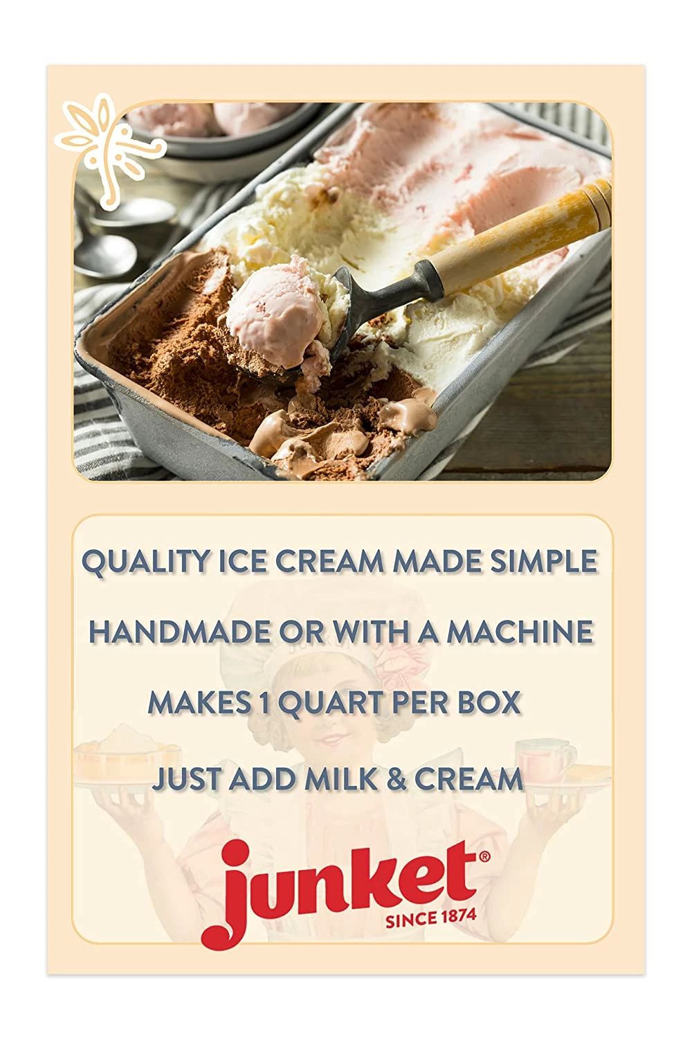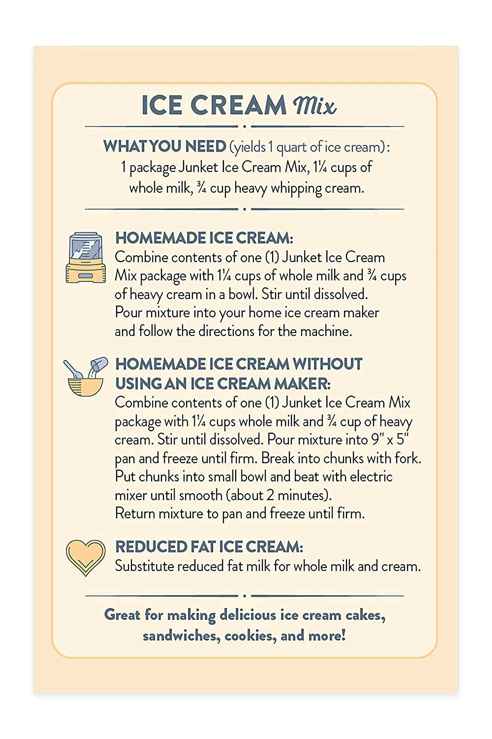 - Each pack of Junket Ice Cream mix yields 1 quart