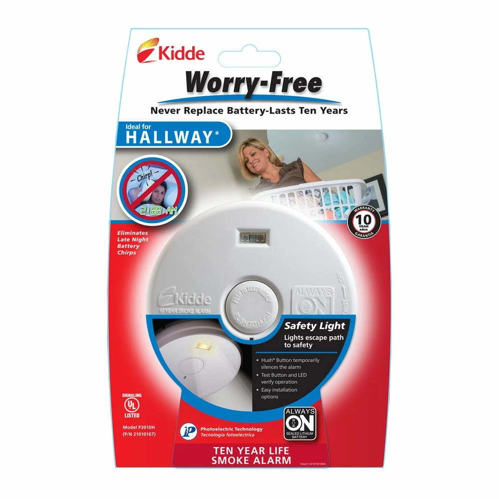 The Kidde P3010H is a 10-year, sealed battery, smoke alarm with photoelectric sensing technology and Smart Hush feature. When smoke or fire is detected, the 85dB alarm tone is accompanied by illumination of bright LEDs to help provide a lighted escape path. The alarm will automatically activate when it is attached to the mounting bracket; there are no pulltabs, no switches, everything is automatic. At the end of alarm life, the unit will chirp, indicating the alarm is in need of replacement. The customer can use a simple tool such as a screwdriver to deactivate the unit, stopping the chirp and making it safe for disposal.