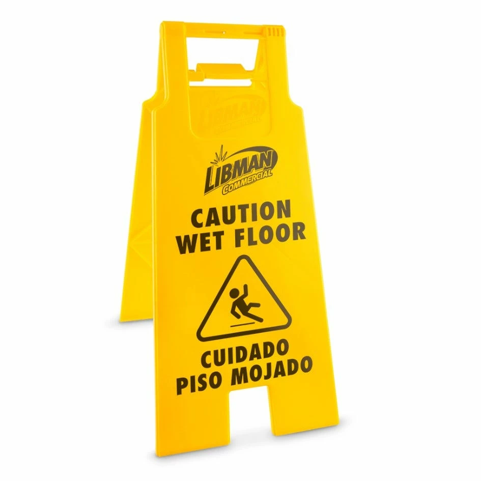 This Caution Wet Floor Sign is yet another uniquely designed product from The Libman Company. In both windy and high traffic areas, the locking tab prevents the sign from collapsing on itself and falling over. The locking mechanism and weight of this sign gives it the stability of a 4-sided sign. The sturdy and durable polypropylene mold ensures this sign will last for a long time without warping or breaking. Limit accidents in any facility with this sign from Libman! Open height of 25” with a base depth of 18” – slightly larger than most signs for greater visibility. Unique locking tab locks sign in open position to prevent collapse and closed position for easy storage. A-frame design for quick set-up. Bilingual for effective communication. Special handle design allows user to simply pinch handle to open up the sign completely with one hand. Heavy-duty polypropylene construction – 90% heavier (on average) than comparable signs. Bright yellow color to stand out. OSHA/ANSI – compliant text and graphic safety warning on both sides. Folds flat for easy storage or transport on carts.
