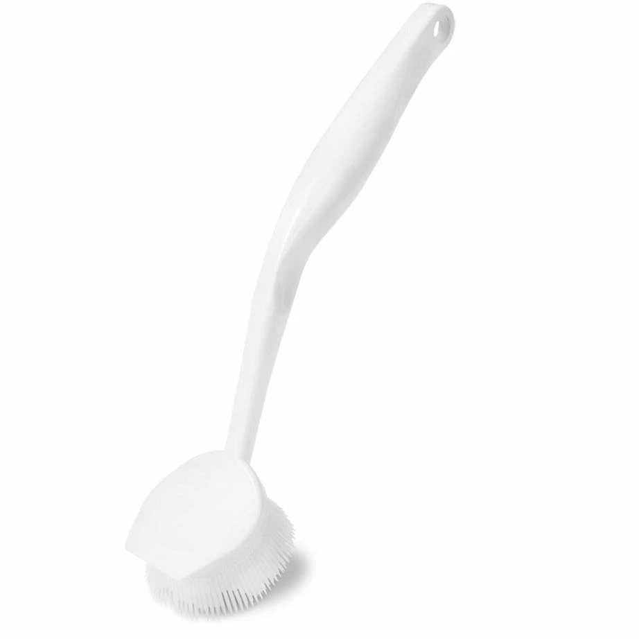Libman’s soft-bristled dish brush has a built-in scraper edge. Perfect for dishes and fine china.