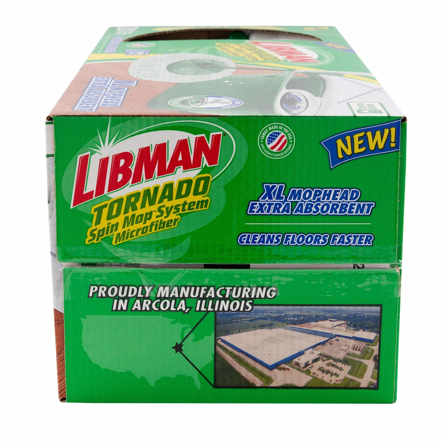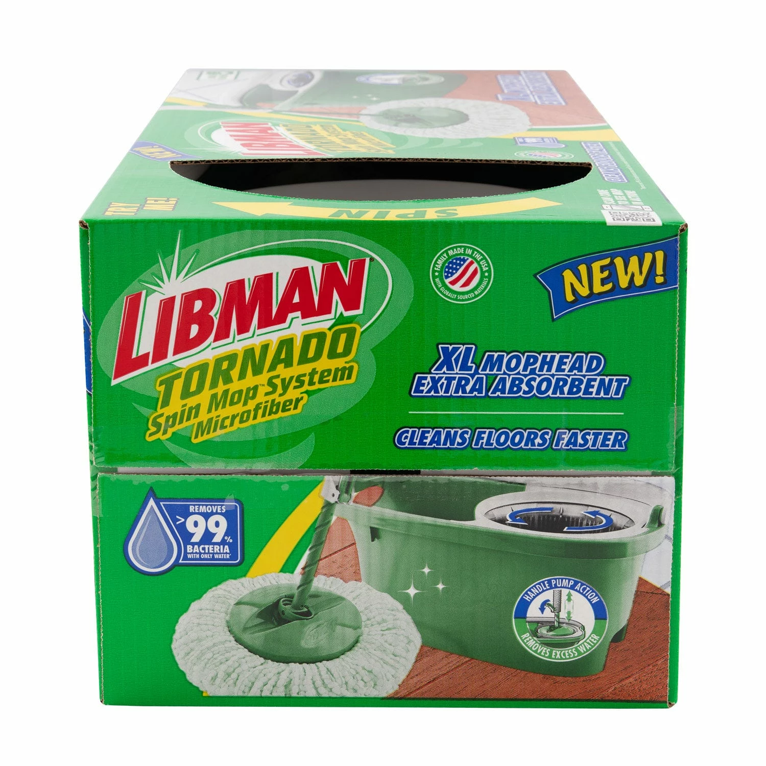 The all-new Libman Tornado Spin Mop System makes cleaning fun, efficient, and easy. The all-in-one mopping system comes complete with a 360° spinning mop and bucket with a spinning wringer chamber. The locking lever allows mopping at user’s preferred length. Push handle down once for a damp mop or more times for a drier mop. This spin mop is the only version on the market in which every component but the microfiber mop head.