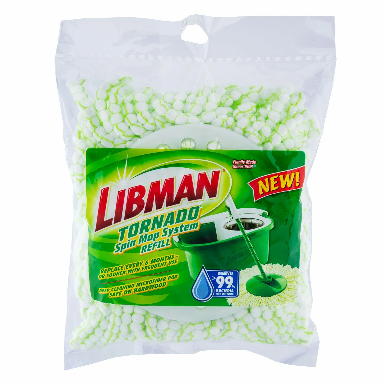 This extra-large, super absorbent Tornado spin mop system refill from Libman cleans floors with efficiency and fun. Simply snap off the dirty mop head, throw it in the wash, and snap on a clean 1. The deep cleaning power of the microfiber is safe on hardwood, tile, smooth, and semi-smooth floor surfaces.