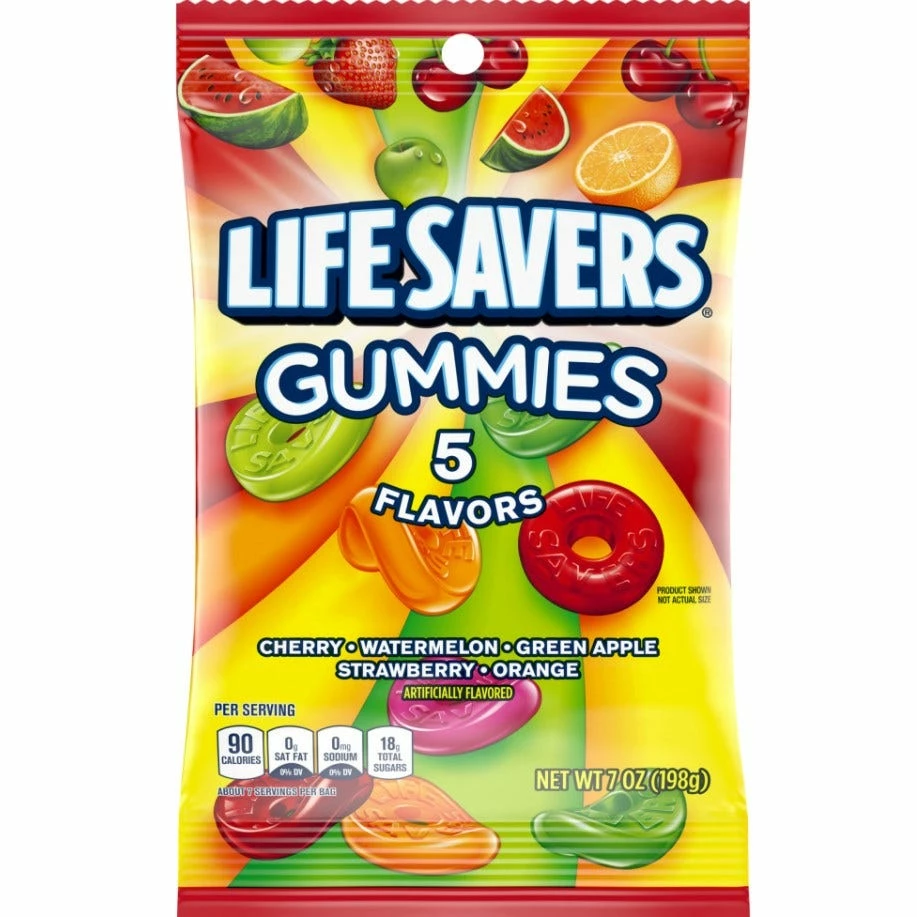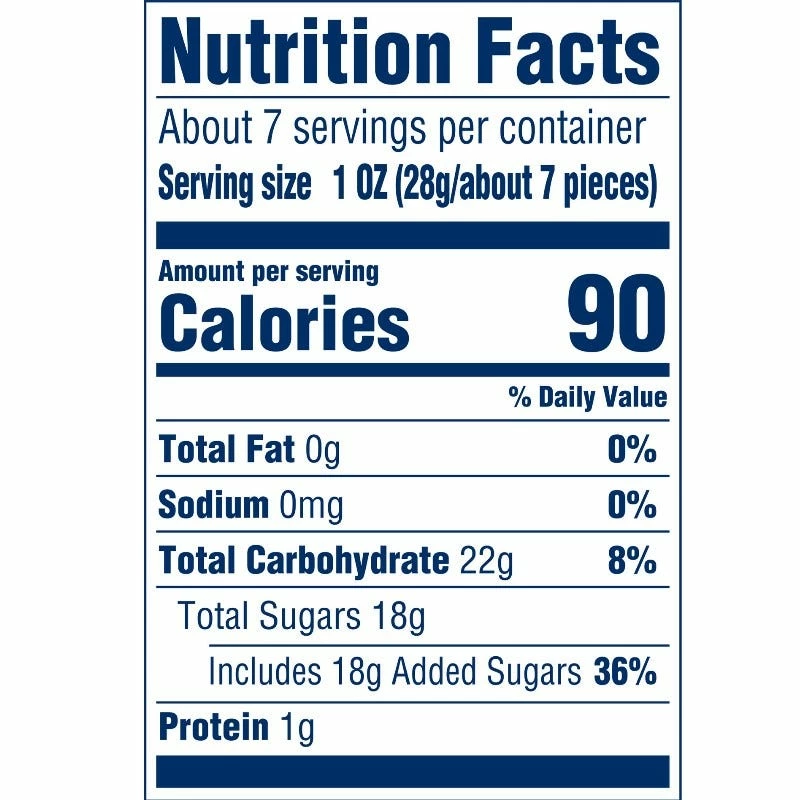 Ingredients: Corn Syrup, Sugar, Water, Modified Corn Starch, Gelatin; less than 2% of: Citric Acid, Natural and Artificial Flavors, Mineral Oil, Colors (Red 40, Yellow 5, Blue 1), Carnauba Wax