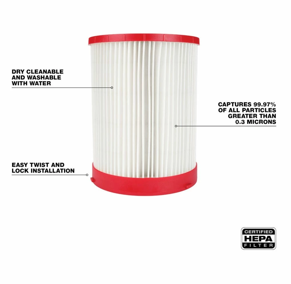 Our Large Wet/Dry Vacuum HEPA Filter is compatible with multiple Milwaukee Wet/Dry Vacuums (0910, 0920, 0930, 0931). An installed HEPA Filter captures 99.97% of all particles greater than 0.3 microns for fine dust collection, ensuring dust and microparticle collection of debris such as concrete dust, sawdust, and drywall dust. You can quickly swap or clean filters with the easy access quarter-turn design. The MILWAUKEE® Large Wet/Dry Vacuum HEPA Filter is dry cleanable and washable with water when necessary. This product contains (1) HEPA Filter.