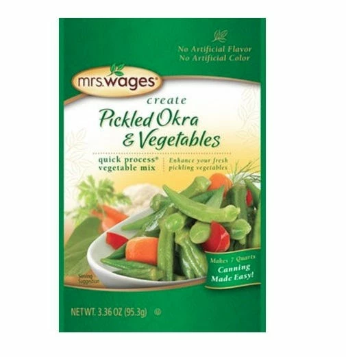 A Southern favorite, Mrs. Wages makes it simple to transform okra and vegetables and preserve your harvest. Each pack makes 7 quarts of crisp, pickled okra and vegetables, the perfect addition to your relish tray, cocktail, salad or as a snack. Before beginning any canning project, be sure to familiarize yourself with the process, the equipment you need and the ingredients. The pickled okra and vegetables are ready to eat 24 hours after preparation.