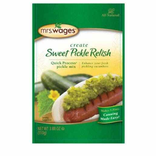 Make your own delicious sweet pickle relish with Mrs. Wages Quack Process Sweet Pickle Relish Mix. The mixes natural herbs and spices enhance the great taste of your fresh pickling cucumbers.