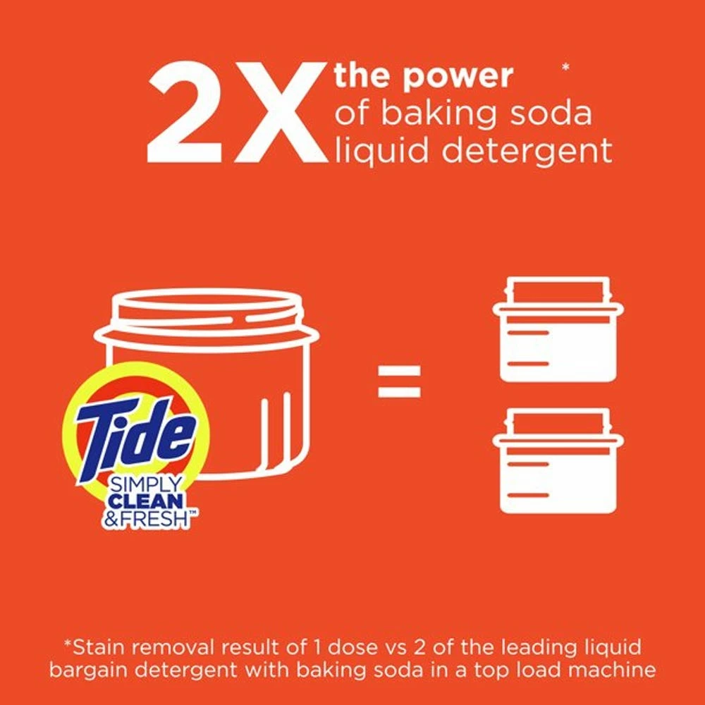 Tide Simply Clean and Fresh liquid laundry detergent has 2X the baking soda power to target tough odors deep in the fibers of your clothes. It is now more concentrated to provide more stain removal and freshness and less water. From America’s #1 detergent, to cover your many laundry needs.