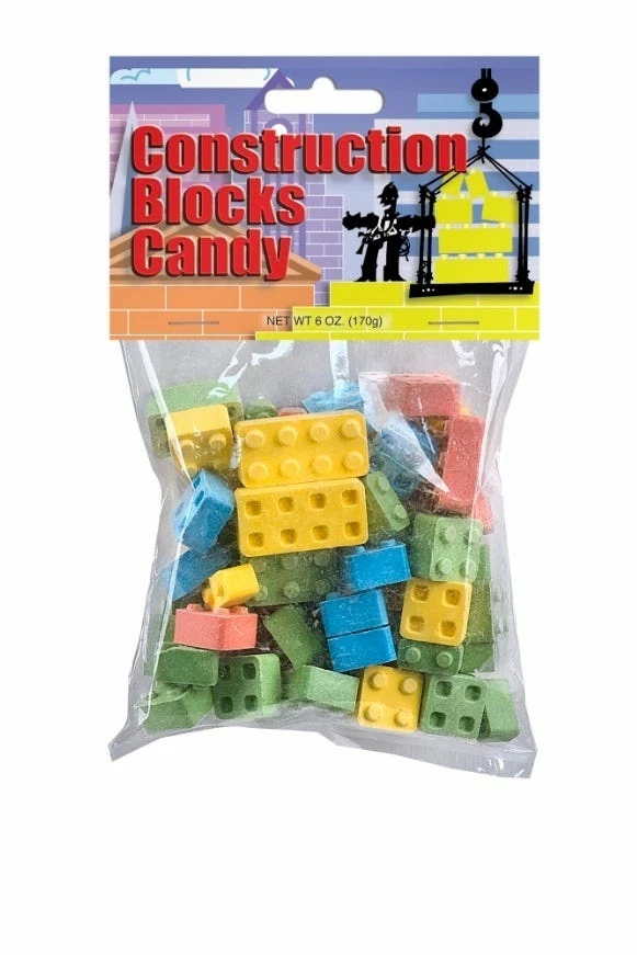 Build them, then eat them – assorted fruit flavor, slightly tart, candy treats that look like building blocks. You can actually stack them like blocks and then eat them.