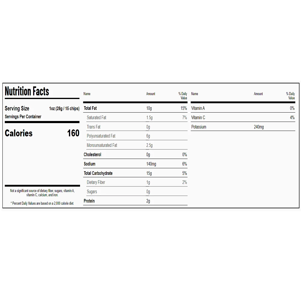 Ingredients: Potatoes, Vegetable Oil (contains one or more of the following: corn, sunflower or cottonseed oil), Salt, Manufactured on equipment that processes products containing dairy, soy and wheat.