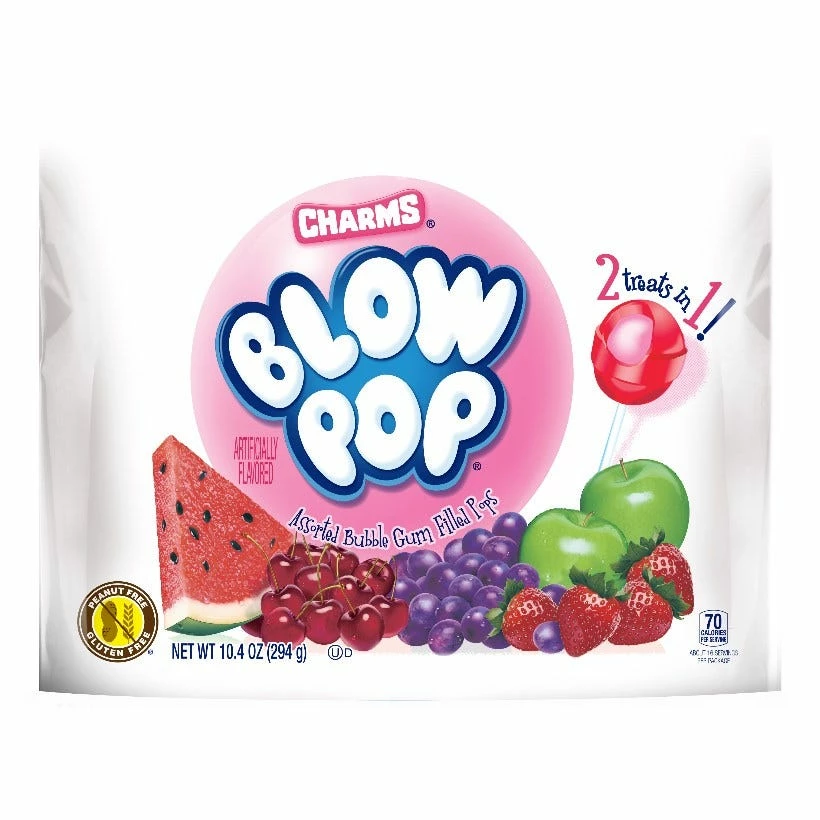 Enjoy the sweet and tangy taste of Charms Blow Pop Assortment Bubble Gum Filled Pops. They are lollipops with a fruit-flavored, hard candy shell and soft bubble gum inside. Each pack weighs 10.4 oz and includes 16 Blow Pops. Charms Bubble Gum is free of sodium, cholesterol and fat. Your purchase includes six different flavors that you can choose from. You can serve them to trick-or-treaters, at parties, or enjoy them as a snack. They’re flavorful and entertaining.