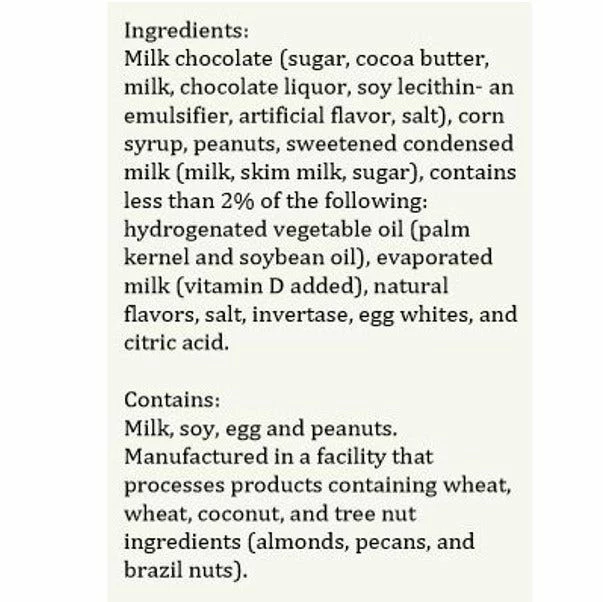 Ingredients: Sugar, Peanuts, Corn Syrup, Cocoa Butter, Fractionated Palm Kernel Oil, Chocolate Liquor, Whole Milk Powder, Non Fat Dry Milk, Whey Powder, Soy Lecithin, Cocoa Powder, Butter, Coconut, Enzyme Modified Soy Protein, Natural Flavors, Salt, Soy Protein Isolate, Wheat Starch, Almonds, Pecans, Walnuts, Cashews, Hazelnuts.