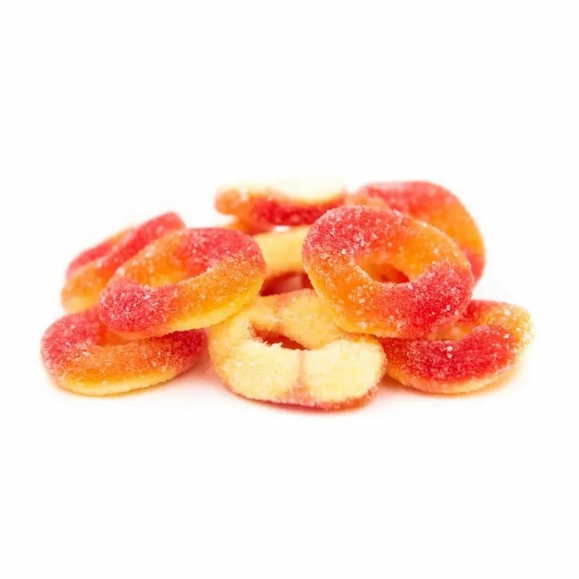Donut shaped peach flavored gummies in a bonus size bag!