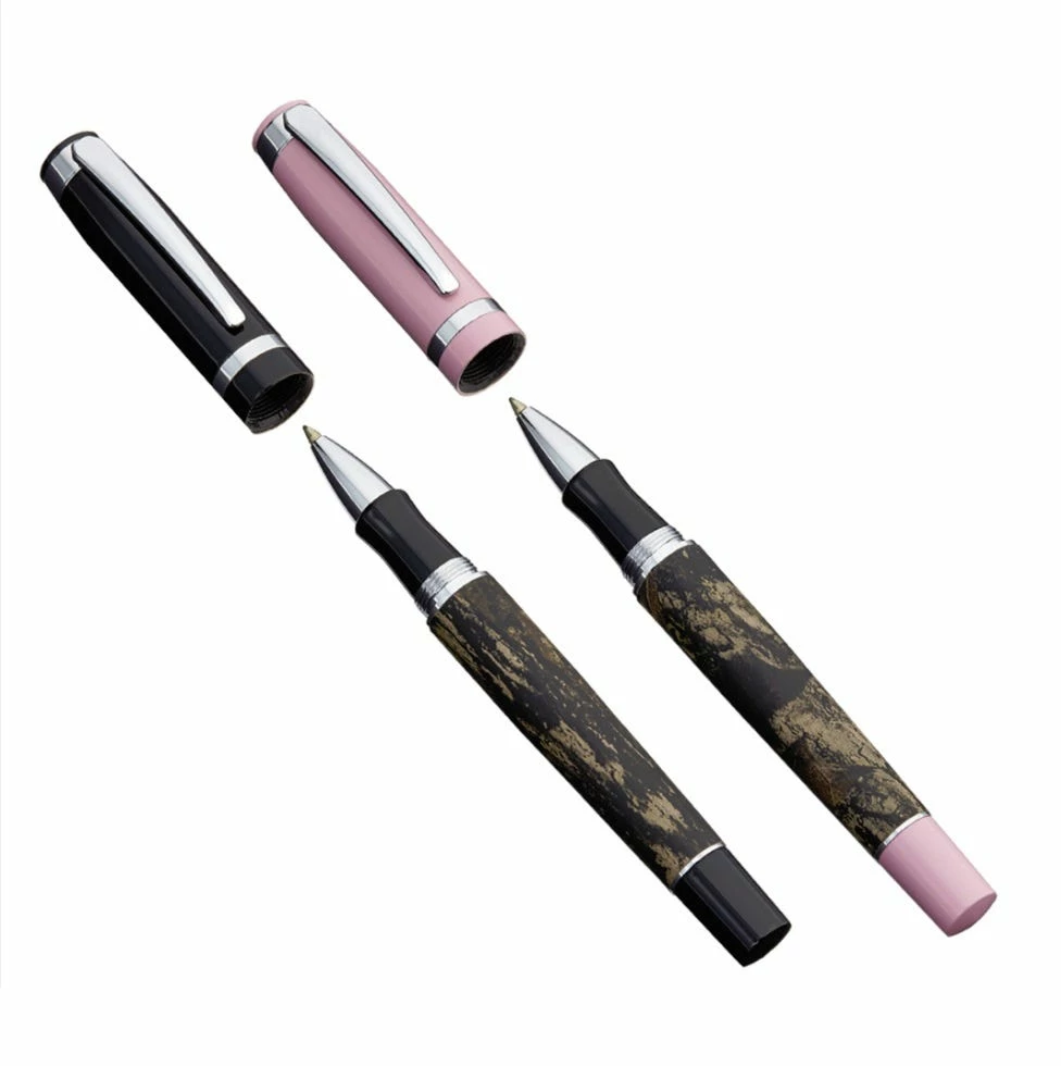 - Pink pen features a regular barrel size; black pen has an oversize barrel